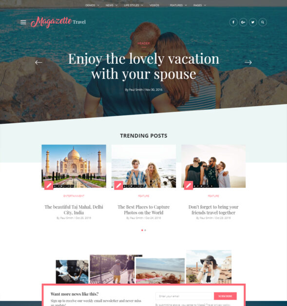 Magazette is a Creative professional multipurpose WordPress theme for magazines, news, blogs and newspaper websites. Used by Pro bloggers to promote contents, rank high in Google and also get your readers stay in your site, reduce bounce rate.