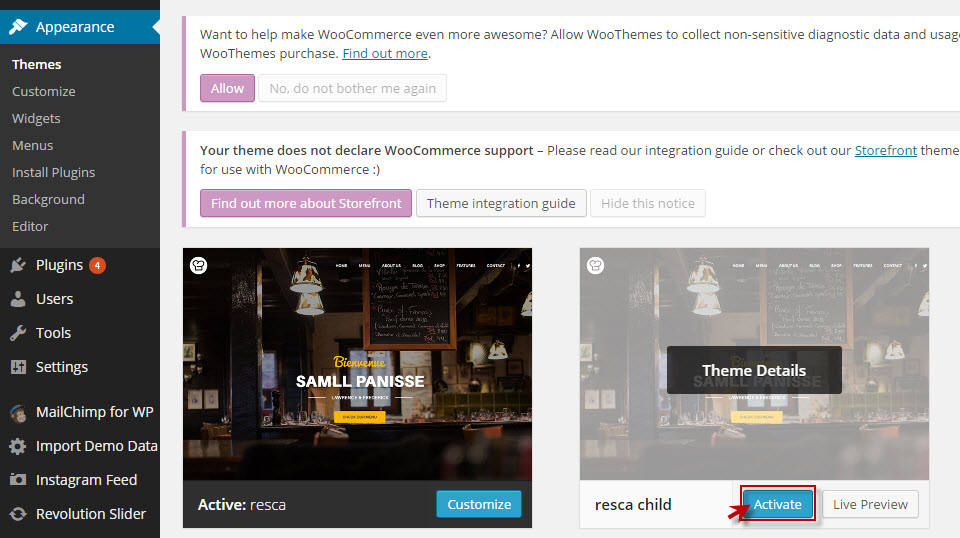 - Activate: Once installed, you’ll see a notification to activate the theme. Click “Activate” to activate the “resca-child” theme.