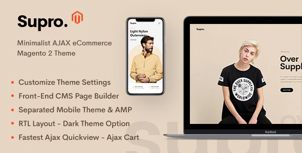 Supro is a clean & minimal AJAX Magento 2 Theme suitable for online stores. With standard UI/UX design and magnificent focus on products, Supro will make your online store look more impressive and attractive to viewers and, as a result, help increase your purchase conversion rate quickly.